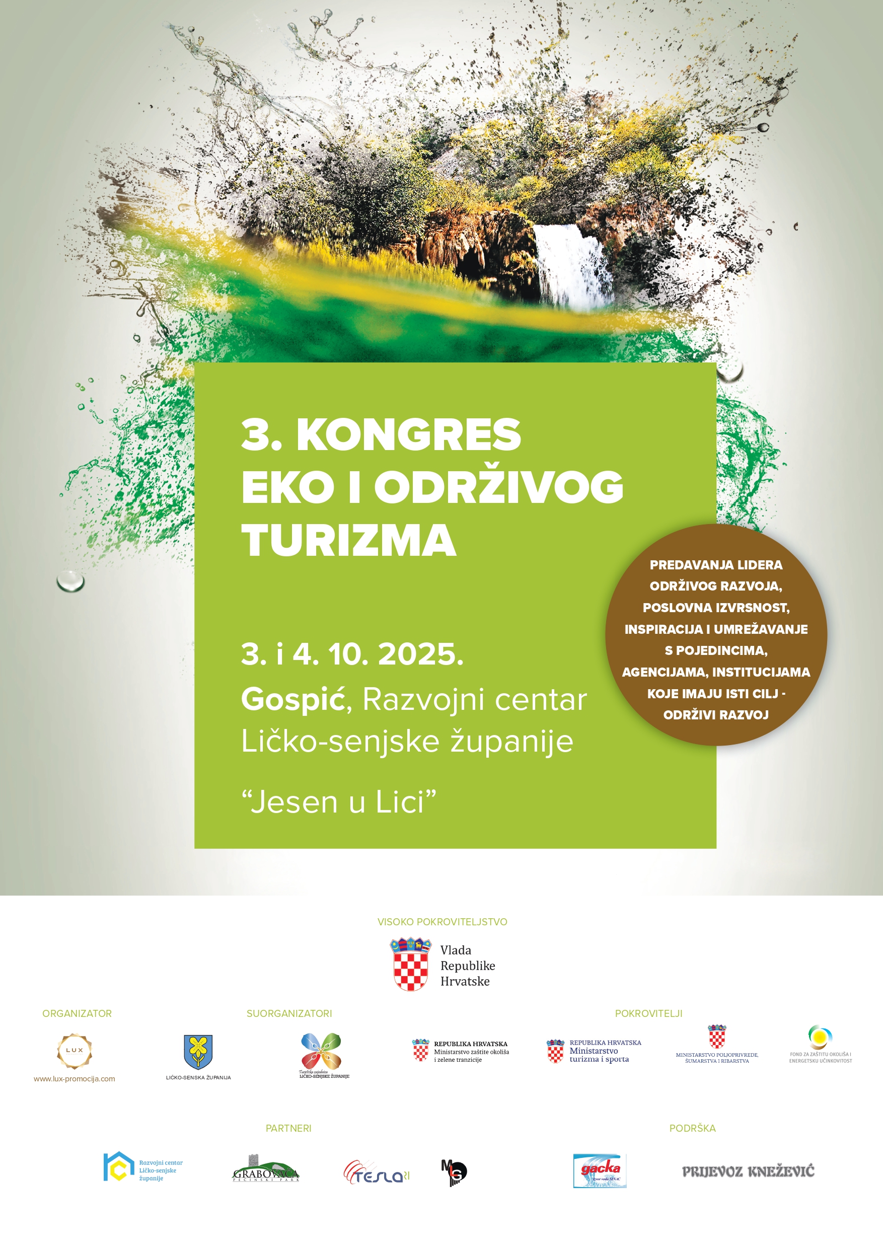 Pod visokim pokroviteljstvom Vlade Republike Hrvatske, u Županijskoj vijećnici Razvojnog centra Ličko-senjske županije u Gospiću 3. i 4. listopada 2025. godine održan je 3. Kongres eko i održivog turizma „Turizam otporan na krize“.